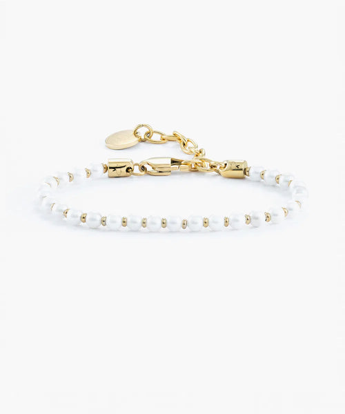 Introducing the Brontide 4mm Pearl bracelet. Handcrafted with genuine and ethically sourced mother-of-pearl, this adjustable bracelet comes in both silver and gold finishes. Complete your look with timeless elegance.